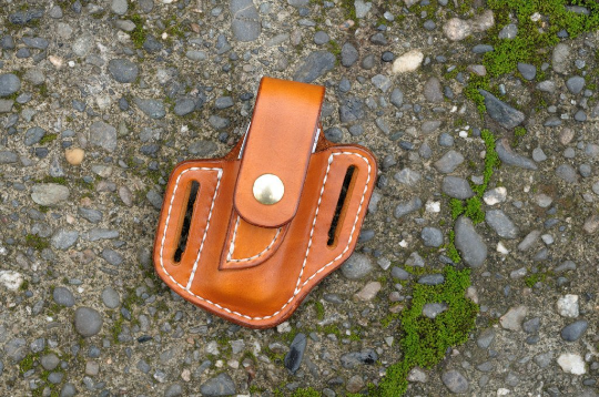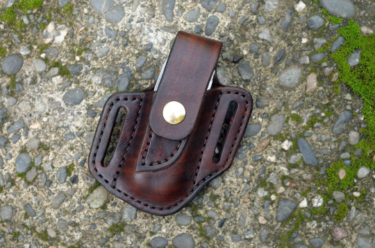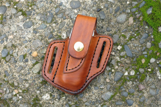 This design came about when a friend asked for something that held his Leatherman Wave at an angle so it was easier to access. Immediately this idea made sense to me and I was off sketching up patterns. Nobody wants a sheath that is bulky and the pancake construction of this one is perfect in that respect. Beauty and functionality through elegant simplicity is my design philosophy and this piece is a perfect example of that. Made from thick, top quality vegetable tanned cowhide, this case is carefully hand molded for a perfect and secure fit. The edges have been hand dressed and burnished for a classic look. Built to last a lifetime, the look and feel of the leather will only improve with age as it takes on your character and personality through use.